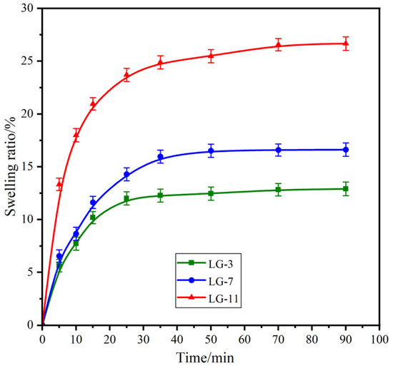 Swelling studies were conducted to investigate the influence of solid content on the performance of the prepared hydrogels. The swelling behaviors of the LG–n with different solid contents were explored over time, and the resulting swelling curves are presented in Figure 6. All samples exhibited a rapid initial increase in SR, followed by gradually slowing down and achieving equilibrium. The time required for LG–3, –7, and –11 samples to reach swelling equilibrium was 25, 50, and 70 min, respectively. The corresponding equilibrium swelling rates (ESRs) for these samples were 11.8%, 16.5%, and 26.4%. The results indicated that with an increase in solid content in hydrogels, both the SR and ESR exhibited a significant rise. This phenomenon can be attributed to two primary factors [44]: one is the hydrophilicity of the PEG segment, which increases with the rising solid content; another is the tighter network structure formed by the higher solid content. Consequently, high solid content could enhance the water–holding capacity of the hydrogel, resulting in a slower SR and a higher ESR. It should be noted that LG–n hydrogels with different solid content presented low swelling properties with ESR values less than 30%.