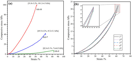 (a) Compressive stress–strain profiles of LG–n hydrogels and (b) cyclic compressive stress–strain profiles of LG–7 hydrogels.