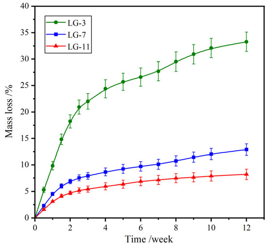 Mass loss curves of LG–n against degradation time in PBS (pH 7.4) at 37 °C (n = 3).