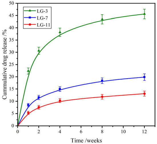 Ceftibuten (CFB), a third-generation cephalosporin antibiotic, is effective against a wide range of GP and GN bacteria. It is recognized for its favorable pharmacokinetic properties and remains widely used in the treatment of respiratory tract infections, otitis media, and uncomplicated urinary tract infections [48,49]. Figure 9 shows the in vitro drug release profiles of CFB from LG–n in PBS (pH 7.4) at 37 °C. Relatively high drug release rates were observed in the initial two weeks, which was the burst release of drug molecules attached to the surface of the hydrogel. After that, the rate gradually slowed down with time. Because the amide groups of CFB could form H–bonds with the amide groups of the crosslinked PEG/ε–PL chain, it was difficult for drug molecules to diffuse out of the hydrogel. Hence, the drug release rate in this stage was primarily controlled by the degradation of the hydrogel. After incubation for 12 weeks, the cumulative drug release (CDR) of LG–3, –7, and –11 was 45.8%, 19.8%, and 12.9%, respectively. Therefore, the effective drug release of LG–n was maintained for more than four months, and the fabricated hydrogels showed a prospective application for long-term drug delivery systems.