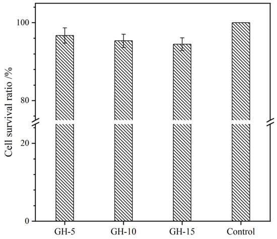The hemolytic behavior of hydrogel was determined according to the requirements of GB/T 14233-2:2005 [60]. The experimental blood was collected from the hearts of healthy rabbits, and sodium citrate (5%) was added to avoid coagulation. The anticoagulated blood (8.0 mL) was diluted with normal saline (NS, 10.0 mL). The tube containing hydrogel (2.0 g) and NS (10 mL) was incubated at 37 °C for 30 min, followed by adding 0.2 mL of diluted blood and incubating for 60 min. After centrifuging for 5 min, the absorbance of the supernatant was obtained by an enzyme-linked immunosorbent assay at 540 nm. The NS and distilled water without hydrogel served as negative and positive controls, respectively. The HR was calculated according to the formula HR (%) = [(As − An)/(Aw − An) × 100, where As, An, and Aw were the absorbance values of the sample, negative control, and positive control, respectively.