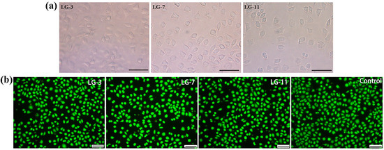 Cytocompatibility is known as the principal step in estimating the biocompatibility of biomaterials. Here, the cell relative growth rate (RGR), survival state, and live/dead activity were adopted to assess the cytocompatibility of LG–n hydrogels with fibroblast L929 as the test cells. Figure 10 presents the RGR of cells cultured in hydrogel extracts for 72 h, as determined by the MTT assay. All the samples exhibited RGR values exceeding 95%, indicating that the solid content had minimal impact on the RGR. Based on ISO 10993–6:2007 standards [50], the cytotoxicity was class 1 and could meet the requirements for in vivo biomaterials. The optical images of cells cultured on the surface of LG–n for 72 h are displayed in Figure 11a. A large number of cells adhered to the surface of the hydrogel and presented an entirely spread morphology with elongated shapes, which manifested that the cells exhibited good survival states [51]. A cell live/dead activity test was performed on the cells cultured with LG–n extracts, and the micrographs are shown in Figure 11b. It was observed that the vast majority of cells remained viable with few dead cells. The survival status of the cells was kept consistent with the control sample. All the results confirmed that LG–n hydrogels possessed excellent cytocompatibility.