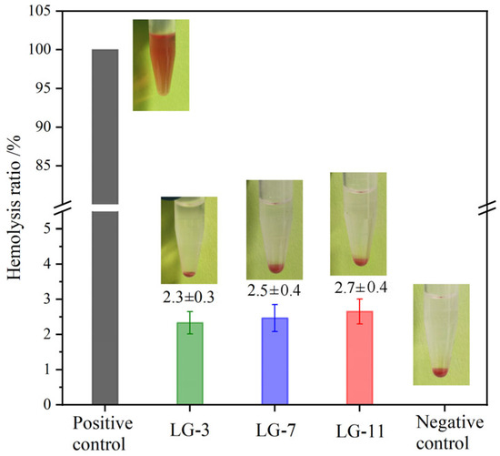 It is difficult for medical materials to avoid contact with blood, and in vitro hemolysis testing is a simple method for evaluating their hemocompatibility in direct contact with blood [52]. The hemolysis tests were performed with anticoagulant rabbit blood, and the hemolysis rates (HRs) and hemolysis effect images for LG–n hydrogels are shown in Figure 12. The supernatant from the positive control displayed a distinct red color, which was attributed to the release of protoheme from the ruptured red blood cells. In contrast, all hydrogel groups appeared transparent with a yellowish hue, which was similar to the negative control. With the HR of the positive control set at 100%, the HR values for LG–3, –7, and –11 were 2.3%, 2.5%, and 2.7%, respectively. Although the HR values exhibited a slight rise with the increase in solid content, they were all lower than 5%, demonstrating that the prepared hydrogels had a low hemolytic effect and good hemocompatibility.