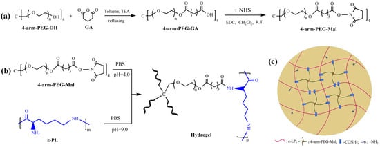 4–Arm–PEG–Mal was synthesized according to the reported method with slight modifications [56], as shown in Figure 14a. Briefly, 4–arm–PEG–OH (1.5 mmol), GA (18.0 mmol), and TEA (18.0 mmol) were dissolved in 150 mL of toluene. After refluxing for 24 h, the solution was concentrated to ~30 mL, which was then precipitated by diethyl ether (200 mL, −5 °C). The obtained crude product was dissolved in CH2Cl2 and precipitated again with diethyl ether. After filtration and vacuum drying at room temperature, the carboxyl–terminated 4–arm–PEG (4–arm–PEG–GA) was obtained with a yield of 82.4%. 4–arm–PEG–GA (1.0 mmol) and NHM (18.5 mmol) were dissolved in 100 mL of CH2Cl2, and a CH2Cl2 solution (30 mL) of EDC (18.5 mmol) was added dropwise to the system under stirring. After stirring for 24 h, the mixture was filtered, and the filtrate was concentrated to ~30 mL. The diethyl ether (200 mL, −5 °C) was added to precipitate the solution. The same purification procedure was performed twice, followed by vacuum drying at room temperature to produce 4–arm–PEG–Mal with a yield of 84.4%.