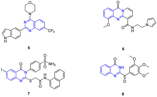 Structures of compound 5, compound 6, compound 7, and compound 8 (the blue is quinazoline structure).