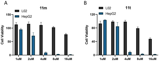 Evaluation of cell viability of L02 and HepG2 by compounds 11m and 11t. (A) Cell viability of HepG2 cells treated with 1, 2, 4, 8, or 16 μM of 11m compounds. (B) Cell viability of HepG2 cells treated with 1, 2, 4, 8, or 16 μM of 11t compounds.