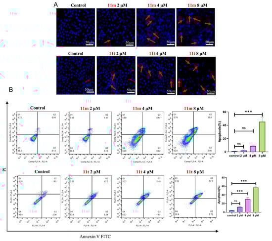 Cell apoptosis induced by 11m and 11t in HepG2 cells. (A) Cell apoptosis morphological changes detected by DAPI staining. (B) Apoptosis quantification detected by Annexin V-FITC/PI staining. Data were mean ± SD. n = 3 for each concentration. ns means p > 0.05, *** p < 0.001, vs. control group. (The red arrow indicates the abnormal nuclear morphology of apoptosis).