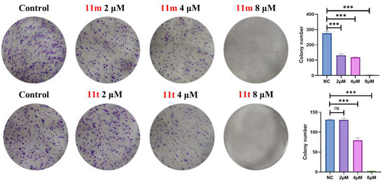 Colony formation pictures of the HepG2 treated with 11m or 11t. ns means p > 0.05, *** p < 0.001, vs. control group.