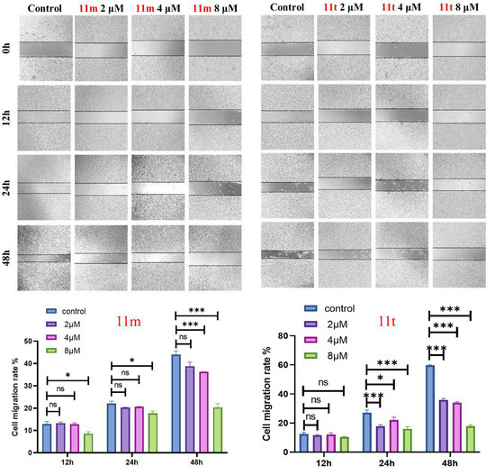 Cell migration inhibition induced by 11m and 11t in HepG2 cells. In vitro cell scratch assays. Photographs of cells at 0, 12, 24, and 48 h after treatment with different concentrations of drugs. Data were mean ± SD. n = 3 for each concentration. ns means p > 0.05, * p < 0.05, *** p < 0.001, vs. control group.