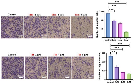 Cell migration inhibition induced by 11m and 11t in HepG2 cells. Transwell migration assays. The migration of cells to the lower surface of the chamber was determined by crystal violet staining. Data were mean ± SD. n = 3 for each concentration. ** p < 0.01, *** p < 0.001, vs. control group.