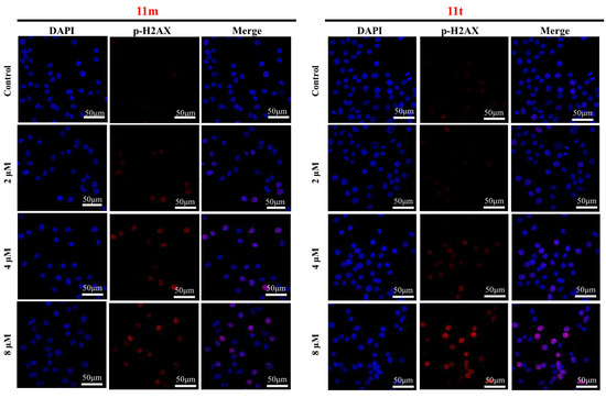 HepG2 cells were seeded in laser confocal culture dishes (Nest, Wuxi, China) and incubated for 24 h, followed by treatment with 11m or 11t (2, 4, and 8 μM) for 24 h. After washing with PBS, cells were fixed with 4% paraformaldehyde at room temperature for 20 min. After washing with PBS, cells were permeabilized with 0.5% Triton X-100 for 20 min, followed by further washing with PBS. Cells were then blocked with goat serum at room temperature for 1 h, followed by incubation with p-H2AX (Cell Signaling Technology, Beverly, MA, USA) at a dilution of 1:500 overnight at 4 °C. After washing with PBS, cells were incubated with Cy3 (Proteintech, Wuhan, China) at a dilution of 1:100 in the dark at room temperature for 1 h. After washing with PBS, nuclei were stained with DAPI for 5 min. Cells were observed and imaged using an oil immersion lens under a laser confocal microscope (Nikon, Tokyo, Japan).