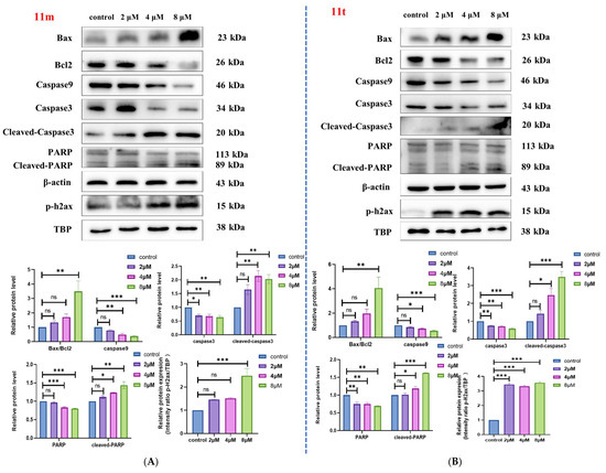Assessment of apoptosis induced by compounds 11m and 11t. (A) Western-blotting results of the protein levels in HepG2 cells treated with 2, 4, or 8 μM of 11m compounds. (B) Western-blotting results of the protein levels in HepG2 cells treated with 2, 4, or 8 μM of 11t compounds. (ns means p > 0.05, * p < 0.05, ** p < 0.01, *** p < 0.001, vs. control group).