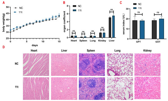 Compound 11t in vivo toxicity of mice. (A) Acute toxicity experiments of compound 11t were conducted in mice. Mouse body weight changed. (B) The acute toxicity experiments examined the effects of compound 11t on mouse organs (C) Effect of acute toxicity experimental studies on blood biochemical indices in mice. (D) H&E staining was performed on various organs of mice treated with compound 11t. (ns means p > 0.05, vs. NC group).