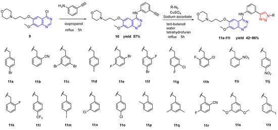 In this synthesis route, 4-(3-((4-chloro-7-methoxyquinazolin-6-yl)oxy)propyl)morpholine (compound 9) underwent an acylation reaction with 3-aminophenylacetylene, yielding terminal alkyne compound 10. These compounds were then reacted with various azide compounds, resulting in the formation of 20 novel target compounds (11a–11t), as shown in Scheme 1. The structures of the target compound were confirmed through 1H and 13C nuclear magnetic resonance (1H NMR and 13C NMR) spectroscopy.