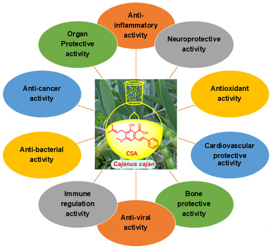 Shao-Mei Sun et al. reported that the active ingredient of cajan leaf, CSA, had anti-inflammatory and analgesic effects. CSA (478, 239, 120 mg/kg) reduced the ear inflammation induced by croton oil in mice in a dose-dependent manner, and its anti-inflammatory effect was greater than that of salicylic acid (a positive control drug, 118 mg/kg). In addition, the CSA preparation agent (at 72, 120, and 200 mg/kg) also had a certain analgesic effect (using aconitine as positive at 0.025 mg/kg), which increased the pain threshold of the mice. At the same time, the CSA preparation agent (10 mg/kg) also had an anti-seepage effect and had a significant inhibitory effect on the permeability of capillaries in the abdominal cavity. There were no adverse reactions at the effective doses [140].