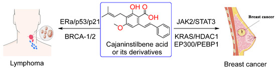 Non-Hodgkin lymphoma (NHL) includes a diverse group of malignancies arising from B and T lymphocytes [41]. Compounds that selectively induce apoptosis in these cells are crucial for treating this disease. B10 (4), which is isolated from Cajanus cajan, effectively inhibited the proliferation of non-Hodgkin lymphoma (NHL) Raji cells by inducing endogenous apoptosis and arresting cells in the S/G1 phase. B10 (4) (12, 18, and 24 µM, IC50 of 18 µM) demonstrated dose- and time-dependent inhibition of Raji cell proliferation. It also reduced cyclin D1 expression by enhancing phosphorylated γ-H2AX levels, inducing DNA damage and cell cycle arrest. Together, B10 (4) induced apoptosis in lymphatic Raji cells by modulating the PI3K-mediated JAK2/STAT3 pathway and the BTK-mediated KRAS/HDAC1/EP300/PEBP1 axis (Figure 3) [31,32].