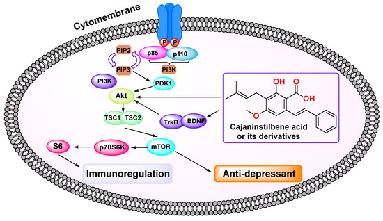 One year later, further investigations demonstrated that CSA (30 or 60 mg/kg) significantly decreased the immobility duration of CUMS mice in both the tail suspension test (TST) and forced swimming test (FST). It (15 or 30 mg/kg) effectively reversed CUMS-induced depression-like behaviors in mice over 3–6 weeks, including increased sucrose preference and reduced feeding latency. The severity of depressive symptoms is strongly linked to reduced tryptophan (TRP) levels [73], and activation of the KYN pathway (KP) [74]. Elevated TRP and BDNF have been associated with enhanced mTOR activation [75,76]. CSA significantly reversed the up-regulation of the KP, reduced kynurenic acid (KYNA) expression, promoted the 5-HT pathway in the cerebral cortex, and thus, increased TRP levels. It also increased BDNF, PSD-95, p-Akt/Akt, and p-mTOR/mTOR levels, suggesting that CSA exerted an antidepressant effect by modulating TRP metabolism, enhancing BDNF expression, and activating the Akt/mTOR pathway (Figure 5), thereby facilitating the synthesis of the postsynaptic protein PSD-95 [77].