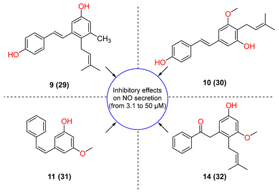 Cajanuslactone (10) reduced TNF-α and IL-1β levels in LPS-induced RAW 264.7 cells and J774A.1 cells. Additionally, it suppressed LPS-induced TNF-α and IL-1β expression levels to 55.0% and 41.8%, respectively, in rats at a concentration of 20 mg/kg. Positive control dexamethasone (5 mg/kg) reduced TNF-α production by 75.8% and IL-1β production by 63.0%. [141]. According to Ling-Xuan Tan et al. research, CSA derivatives 9 (29), 10 (30), 11 (31), and 14 (32) (Figure 8) (3.1–50 μM) isolated from Cajanus cajan leaves, exhibited moderate inhibitory effects on LPS-induced NO secretion in RAW264.7 cells [142].