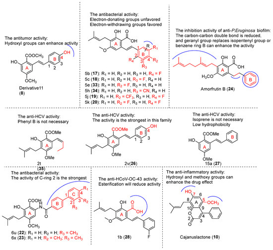 Jia-Zhong Cai et al. first reported naturally occurring ether derivatives 3-monochloro-1,2-propylene glycol (3-MCPD), cajanstilbene H (5), which could promote osteoblast differentiation in hMSC, showing the potential to alleviate osteoporosis. Moreover, cajanstilbene H (5) showed moderate inhibition of six human cancer cell lines (NCI-H460, PC-3, MCF-7, HeLa, HCT-15, and KB-V1) (IC50 of 21.42–25.85 µM), with paclitaxel (IC50 of 0.021–0.225 µM) used as a control [42]. Amorfrutin B (24), exhibited moderate cytotoxic activity against PANC-1 cells (IC50 of 12 µM) under glucose starvation conditions, as reported by Tadafumi Fujita et al. [33].