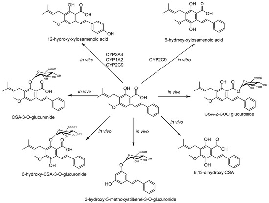 By applying liquid chromatography with the tandem mass spectrometry method, researchers found that CSA distributes rapidly and extensively with rapid elimination (Tmax of 10.7 ± 0.31 min, t1/2 of 51.40 ± 6.54 min), particularly in the small intestine, liver, and kidneys after oral administration [20]. Its oral bioavailability is approximately 44.36% [21]. Xin Hua et al. identified two metabolites, M1 (12-hydroxy-xylosamenoic acid) and M2 (6-hydroxy-xylosamenoic acid) (Scheme 1), involved in CSA metabolism using human liver microsomes and recombinant human P450 enzymes in vitro assays. The major CYP450 enzymes responsible for CSA hydroxylation in liver microsomes are CYP3A4, CYP2C9, and CYP1A2. CYP2C9 catalyzes all oxidative metabolite formations, while CYP3A4 and CYP1A2 are involved in M1 formation. CSA reversibly inhibits CYP3A4 and CYP2C9 activity (IC50 of 28.3 and 31.3 µM, respectively) [20,21]. Li-Sha Wang et al. reported five rat metabolites of CSA (M1-M5): CSA-3-O-glucuronide, CSA-2-COO glucuronide, 6,12-dihydroxy-CSA, 3-hydroxy-5-methoxystilbene-3-O-glucuronide, and 6-hydroxy-CSA-3-O-glucuronide (Scheme 1). Studies indicate extensive conversion of CSA to its metabolites, particularly glucuronic acid metabolites, primarily through the hepatic metabolism into the systemic circulation, with glucuronide-conjugated and hydroxylated metabolites excreted via bile. M1 (CSA-3-O-glucuronide), formed post-first-pass metabolism, reduces CSA’s oral bioavailability. Furthermore, CSA’s enterohepatic circulation, extravascular distribution, and renal reabsorption characteristics contribute to delayed elimination. Notably, metabolism within the body, rather than absorption, represents the primary limitation to CSA’s oral bioavailability [22,23].