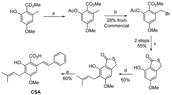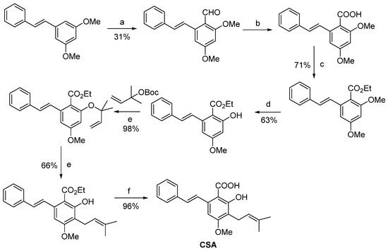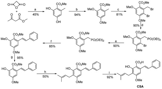 - Chen, Q.; Lu, K.; Zheng, C.; Xu, X.-F.; Lin, J.; Chen, W.-M. A facile synthesis of cajaninstilbene acid and its derivatives. Chin. Chem. Lett. 2019, 30, 1527–1529. [Google Scholar] [CrossRef]