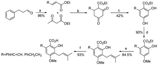 - Aidhen, I.S.; Mukkamala, R.; Weidner, C.; Sauer, S. A Common Building Block for the Syntheses of Amorfrutin and Cajaninstilbene Acid Libraries toward Efficient Binding with Peroxisome Proliferator-Activated Receptors. Org. Lett. 2014, 17, 194–197. [Google Scholar] [CrossRef] [PubMed]