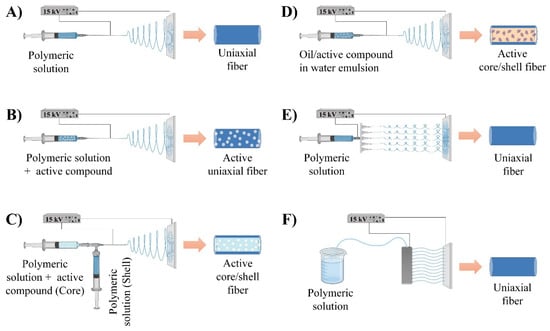 Electrospinning processing based on systems: (A) uniaxial, (B) uniaxial to encapsulate active compounds, (C) coaxial, (D) emulsion, (E) multiaxial, and (F) needleless.