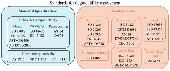 International standards have been established to systematically evaluate the biodegradation and compostability of plastic materials (Figure 2). Recently, it was determined that a combination of standards should be used to substantiate and certify compostability claims in different environments [60,61]. For packaging purposes, at the European level, the EN 13432 standard [62] establishes the requirements for packaging recoverable through composting and biodegradation. The requirements are at least 90% disintegration after 12 weeks, 90% biodegradation (CO2 evolvement) in 6 months, and the inclusion of tests on ecotoxicity and heavy metal content.