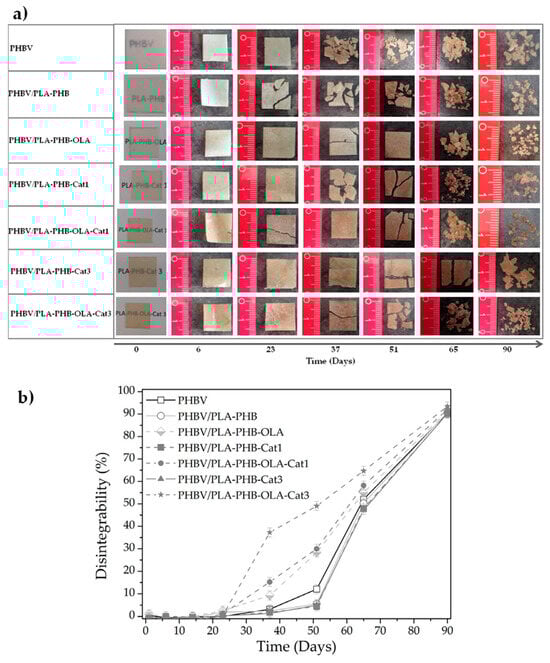 Disintegration of bilayer films at different incubation times under composting conditions: (a) visual appearance and (b) disintegration kinetics. From Arrieta et al. [11] used under a Creative Commons CC—BY license.