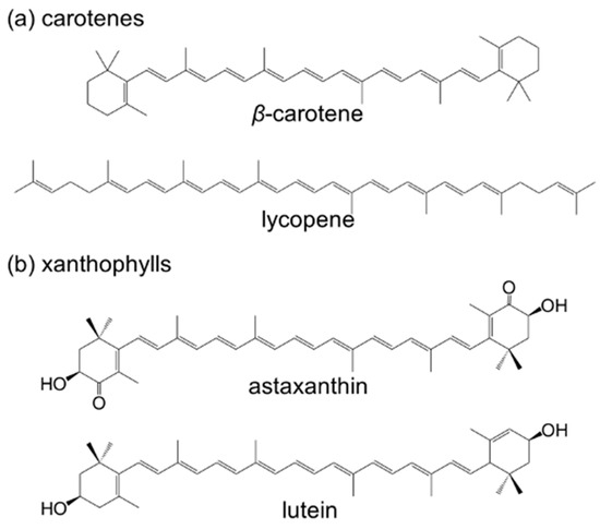 Chemical structures of the carotenoids: (a) β-carotene and lycopene (carotenes) and (b) astaxanthin and lutein (xanthophylls).