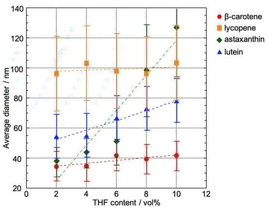 Relationship between the average size of the carotenoid-based NPs and the contents of THF used as a good solubilizing solvent in the reprecipitation method. The size of the NPs was measured by dynamic light scattering (DLS). Error bars show the size distribution.