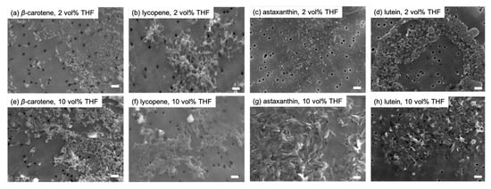 The respective carotenoid-based NP dispersions in THF were prepared with final THF concentrations of 4, 6, 8, and 10 vol%. In a series of experiments, a solution of each carotenoid in THF was injected into a THF/water mixture rather than into pure water. THF in the mixture served to control the crystal growth rate during reprecipitation. The DLS results indicated that the sizes of the xanthophyll-based NPs (astaxanthin and lutein) increased with increasing THF content, whereas those of the carotene-based NPs (β-carotene and lycopene) showed no significant change (Figure 3). SEM images of the NPs obtained for a THF concentration of 10 vol% demonstrated that the carotene-based NPs maintained their shapes, as observed in the case of the 2 vol% samples, whereas the xanthophyll-based NPs exhibited well-developed facets (Figure 4e–h), which indicate that the NPs became more crystalline as THF content increased.