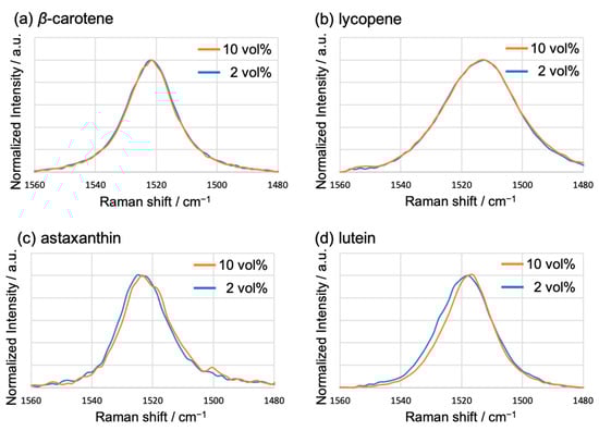 Raman spectra of the NPs of (a) β-carotene, (b) lycopene, (c) astaxanthin, and (d) lutein, displaying the ν1 peak corresponding to the C=C stretching vibration. The THF contents are 2 (blue line) and 10 vol% (orange line).