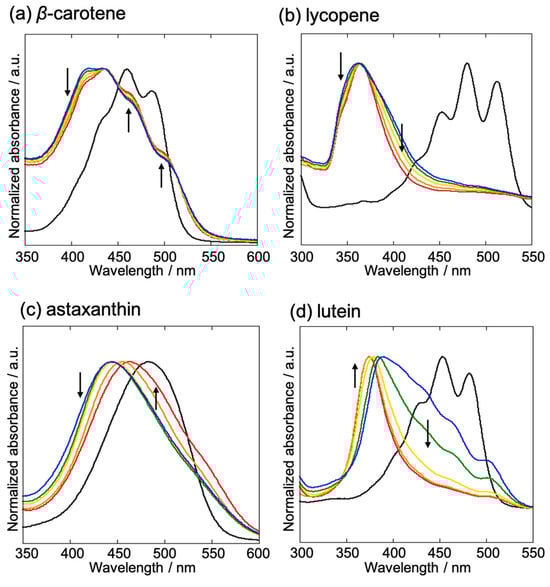 UV-vis absorbance spectra of (a) β-carotene, (b) lycopene, (c) astaxanthin, and (d) lutein. Each spectrum was recorded by varying the amount of THF used in the reprecipitation method, that is, 2 (blue), 4 (green), 6 (yellow), 8 (orange), and 10 (red) vol%. The direction of the arrow indicates the shift in the absorption spectrum with increasing THF content (2 vol% to 10 vol%). The black lines represent the spectra obtained for the respective carotenoids dissolved in pure THF.