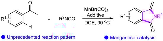 In 2021, Wang’s group presented Mn-catalyzed [3 + 2] cyclization reaction involving ketones and isocyanates through inert C–H activation (Scheme 5) [26]. The method not only offers an efficient synthetic route but also underscores the catalytic role of manganese in this transformation. Through detailed experimental validation and exploration of the reaction mechanism, the distinctive features and potential applications of this reaction are elucidated. This research introduces a new paradigm in the field of manganese-catalyzed oxidative cyclization reactions, offering valuable insights for further research and development in related areas.