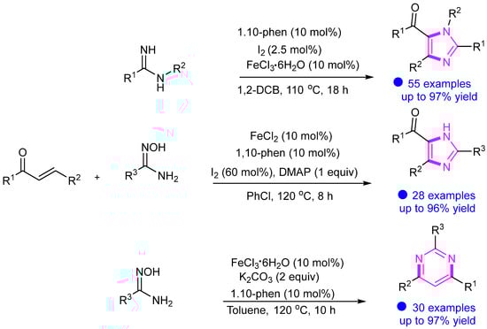 As an inexpensive metal, iron catalysis plays an important role in the synthesis of many nitrogen-containing heterocyclic compounds. In 2015 and 2018, we reported iron-catalyzed syntheses of highly substituted imidazoles and pyrimidines from readily available α,β-unsaturated ketones and amidines (Scheme 6) [27,28]. In these reactions, two C–N bonds were simultaneously constructed via metal catalysis.