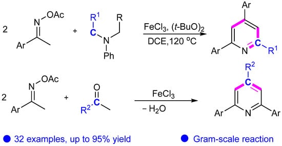 In 2016, Guan’s group developed a novel and efficient iron-catalyzed cyclization of ketoxime carboxylates with dialkylanilines or aldehydes (Scheme 7) [29,30]. The reaction begins with the cleavage of the N–O bond in ketoxime carboxylates, facilitated by an iron catalyst. The catalytic effect of iron is highly effective, resulting in a reaction yield of up to 95%. In addition, the product yield of the gram-scale reaction is also excellent.