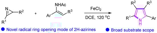 In 2018, Guan’s group also described the iron-catalyzed radical cycloaddition of 2H-azirines and enamides as a novel strategy for the synthesis of pyrroles (Scheme 8) [31]. The efficient protocol showcases the versatility of iron catalysis in the construction of pyrrole frameworks. Through a systematic investigation of the reaction conditions and mechanistic pathways, this research elucidates the synthetic route and highlights the significance of iron catalysis in enabling the formation of pyrroles. The developed methodology offers a valuable tool for accessing diverse pyrrole derivatives and contributes to the advancement of synthetic methodologies in heterocyclic compound synthesis.