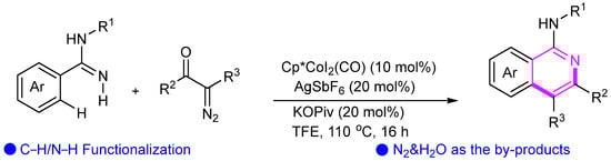 - Li, J.; Tang, M.; Zang, L.; Zhang, X.; Zhang, Z.; Ackermann, L. Amidines for Versatile Cobalt(III)-Catalyzed Synthesis of Isoquinolines through C–H Functionalization with Diazo Compounds. Org. Lett. 2016, 18, 2742–2745. [Google Scholar] [CrossRef] [PubMed]