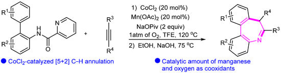 Zhong’s group also established Co(II)-catalyzed regioselective and stereoselective [5 + 2] C(sp2)–H annulation of o-arylanilines with alkynes through sequential C–C/C–N bond formation (Scheme 10) [33].