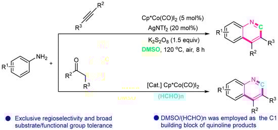 In 2018, Yi’s group developed a protocol for Co-catalyzed annulation reactions between anilines and alkynes involving C–H activation [34,35]. This method features a broad substrate range, a simple operational protocol, and moderate-to-good yields. DMSO/paraformaldehyde liquor served both as the solvent and as the source of the quinoline C1 product (Scheme 11). This method enriches the synthesis methods of quinolines and lays a foundation for their future application.