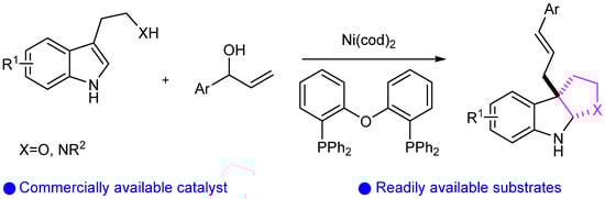 - Zhang, H.-J.; Gu, Q.; You, S.-L. Ni-Catalyzed Intermolecular Allylic Dearomatization Reaction of Tryptophols and Tryptamines. Org. Lett. 2019, 21, 9420–9424. [Google Scholar] [CrossRef]