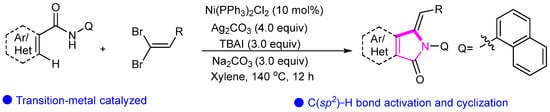 Additionally, our group disclosed an efficient, operationally simple and scalable nickel-catalyzed inactivated C(sp2)–H bond activation and cyclization for the synthesis of divergent isoindolinones with excellent selectivity from readily available gem-dibromoalkenes (Scheme 15) [39].
