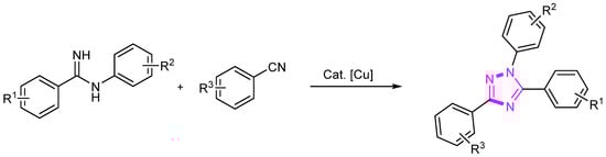 Copper is another transition metal that has found extensive application in organic synthesis, particularly in the formation of carbon–nitrogen bonds. In 2016, we reported copper-catalyzed synthesis of 1,3,5-trisubstituted 1H-1,2,4-triazoles (Scheme 16) [40]. This protocol demonstrates the efficiency of copper catalysis in constructing these valuable heterocyclic compounds. The established methodology provides a direct route for synthesizing diverse derivatives of triazoles, contributing significantly to the advancement of synthetic methodologies in heterocyclic compound synthesis.