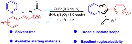 Recently, we synthesized indolizine using pyridine, acetophenone, and nitroolefin under CuBr catalysis (Scheme 18) [44]. This reaction underscores the importance of catalysts and oxidants in facilitating chemical transformations and producing valuable organic compounds. Furthermore, the reaction occurs under solvent-free conditions, reflecting environmental friendliness.