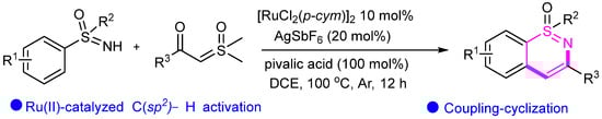 - Xie, H.; Lan, J.; Gui, J.; Chen, F.; Jiang, H.; Zeng, W. Ru (II)-Catalyzed Coupling-Cyclization of Sulfoximines with alpha-Carbonyl Sulfoxonium Ylides as an Approach to 1,2-Benzothiazines. Adv. Synth. Catal. 2018, 360, 3534–3543. [Google Scholar] [CrossRef]