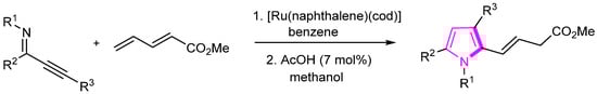 - Kurita, S.; Kiyota, S.; Komine, N.; Hirano, M. Ru(0)-Catalyzed Synthesis of Conjugated Iminotrienes and Subsequent Intramolecular Cyclization Giving Polysubstituted Pyrroles. Org. Lett. 2022, 24, 2973–2977. [Google Scholar] [CrossRef]