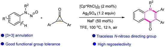 - Liu, Y.; Tian, Y.; Su, K.; Wang, P.; Guo, X.; Chen, B. Rhodium(iii)-catalyzed [3 + 3] annulation reactions of N-nitrosoanilines and cyclopropenones: An approach to functionalized 4-quinolones. Org. Chem. Front. 2019, 6, 3973–3977. [Google Scholar] [CrossRef]