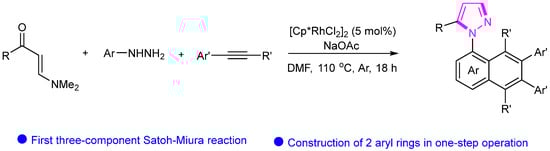 In 2023, Wan’s group reported the three-component synthesis of N-naphthyl pyrazoles utilizing a Rh(III)-catalyzed cascade pyrazole annulation and Satoh–Miura benzannulation strategy (Scheme 25) [51]. The innovative protocol showcases the efficacy of Rh(III) catalysis in the construction of these complex heterocyclic compounds. Through a systematic examination of the reaction conditions and mechanistic pathways, this research elucidates the synthetic route and emphasizes the crucial role of Rh(III) catalysis in enabling the formation of N-naphthyl pyrazoles. The developed methodology offers a valuable tool for accessing diverse derivatives of pyrazoles, contributing significantly to the advancement of synthetic methodologies in heterocyclic compound synthesis.