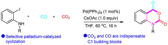 Lu’s group reported a Pd-catalyzed cyclization reaction for synthesizing isatoic anhydrides from CO2, CO, and o-iodoanilines (Scheme 26) [52], where CO2 and CO served as C1 building blocks for the isatoic anhydride products. In the following year, Fan’s group also reported the synthesis of isoindolo[2,1-b]isoquinoline-5,7-diones through Pd-catalyzed cyclization of isoquinolones with CO (Scheme 27) [53].